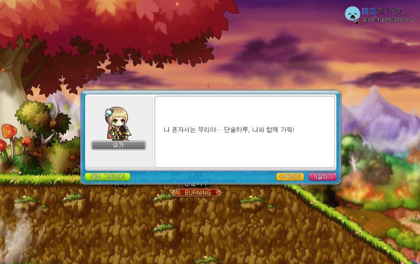 c. 단풍나무 언덕은 루카스 촌장이 있던 곳에서 왼쪽의 포탈을 타고 계속 오다 보면 있습니다. 슈가와 대화하면 불을 꺼 달라며 양동이에 물을 길어 오라고 합니다. 우선 양동이를 가지러 가기 위해 다시 루카스 촌장에게 갑니다.
