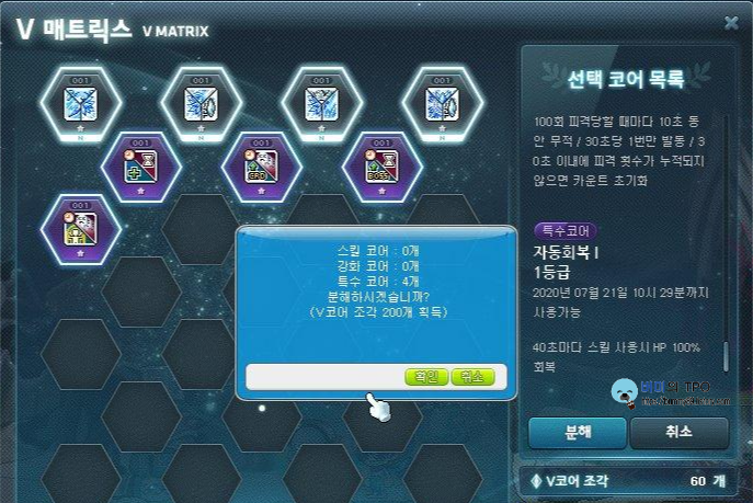 코어 마스터를 통해 V 매트릭스에 접속하고 코어 분해를 할 수 있습니다. 분해하고 싶은 코어를 선택하고 분해하면 됩니다. 코어를 분해하면 V 코어 조각을 얻을 수 있습니다.