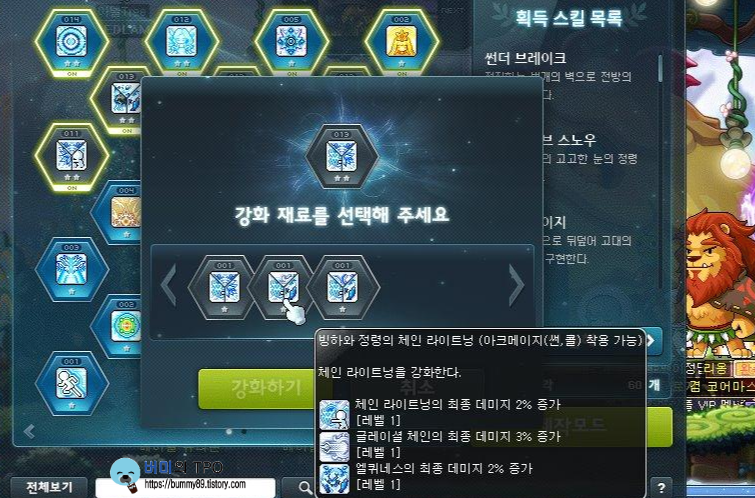 강화 코어는 5차 이전의 스킬을 강화하는 코어입니다. 3개의 스킬이 같이 있기 때문에 3줄 코어라고도 합니다. 위 사진을 보면 썬콜의 4차 스킬인 체인 라이트닝, 라이트닝 스피어, 프로즌 오브가 같이 묶여 있습니다.