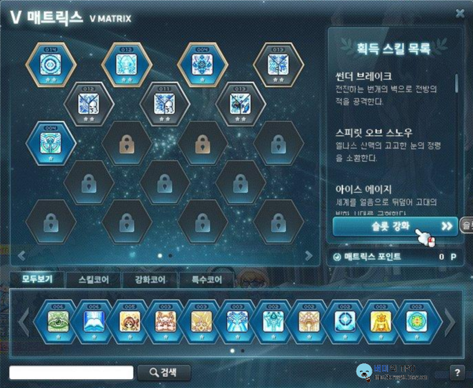 *슬롯 강화는 스킬 창의 V 매트릭스에서 매트릭스 포인트로 강화할 수 있습니다. 매트릭스 포인트는 레벨업 당 1개를 줍니다.