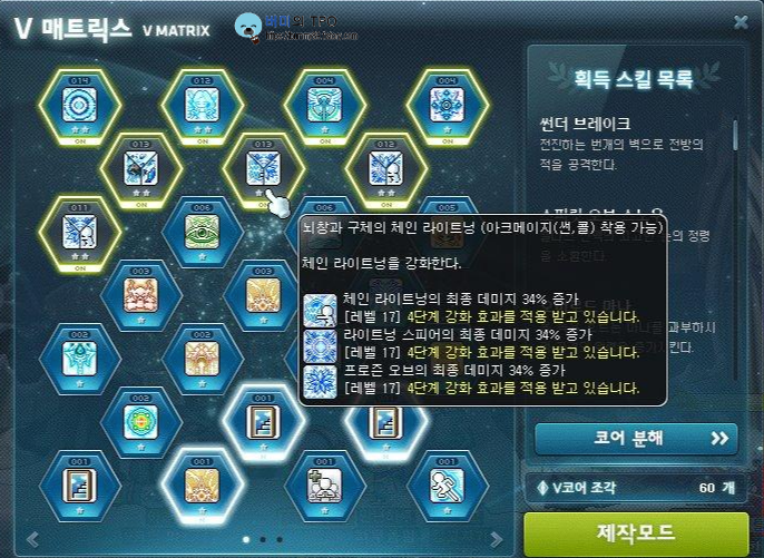 코어 마스터를 통해 V 매트릭스에 접속하고 코어를 제작할 수 있습니다. 원하는 스킬을 선택하고 제작하면 됩니다. 간단하죠?