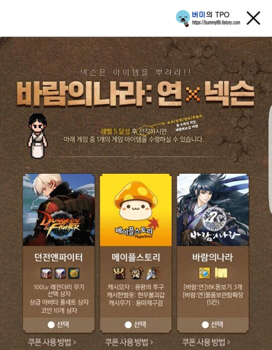 넥슨의 바람의 나라 게임이 모바일로 출시됐습니다. 출시 기념으로 바람의 나라 : 연을 플레이하면 다른 넥슨 게임의 아이템을 얻을 수 있는 쿠폰을 줍니다.