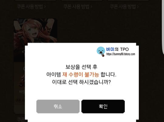 보상 선택 시 제대로 선택했는지 확인 창이 뜹니다. 확인을 눌러 주세요. 다시 아래의 아이템 보상 쿠폰 확인을 누르면 쿠폰이 발행됩니다.
