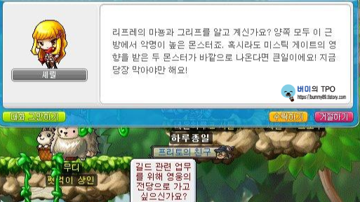 b. 리프레 심술쟁이의 숲 미스틱 게이트에 들어갑니다. 몬스터를 처치하고 리프레 마을로 돌아가 셰릴에게 대화합니다.