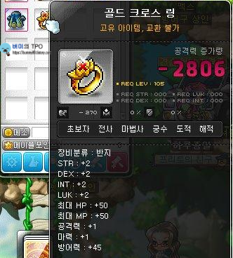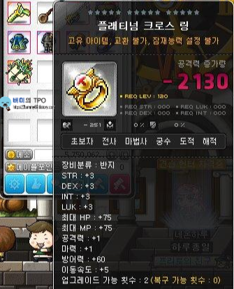 쳅터 2를 종료 하고 장비 창을 열어보면 짜잔! 플래티넘 크로스 링이 들어있습니다. 플래티넘 크로스 링은 주문서를 통해 업그레이드를 할 수 있고 스타포스 강화도 가능합니다. 왜 초보자들의 필수 반지라고 하는지 지 알겠죠?