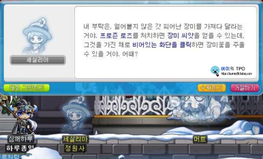 f. 다시 이피아가 있는 곳으로 돌아와 이피아와 대화합니다. 마지막 부탁으로 장미정원의 세실리아에게 가보라고 합니다. 장미정원은 이피아가 있는 맵에서 오른쪽 포탈을 타면 입장가능합니다.