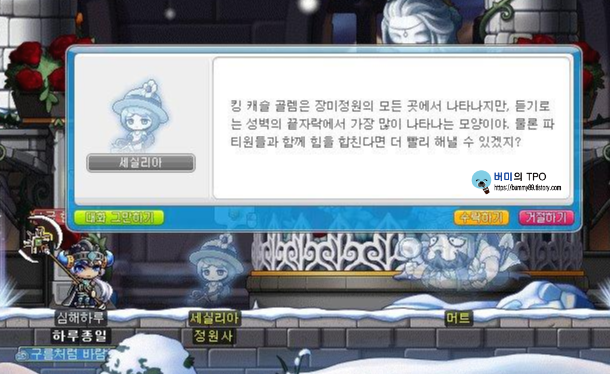 o. 세실리아의 마지막 임무는 킹 캐슬 골렘을 처치하는 것입니다. 킹 캐슬 골렘은 장미정원 모든맵에서 랜덤하게 출현하며 채널이동으로 이미 출현한 골렘을 잡는 것이 가장 좋은 방법입니다. 만약 장미정원을 돌아다녀도 골렘이 없다면 한 맵에서 계속 몬스터를 사냥하면 출현합니다. 킹 캐슬 골렘을 처치하고 다시 세실리아에게 돌아갑시다.